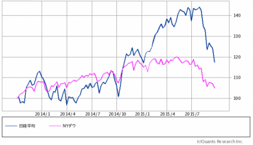 上のグラフはアメリカのNYダウと日経平均を過去2年間で比較したものですが、