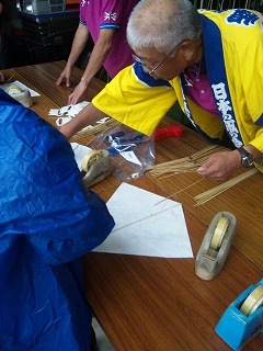 凧作りの先生が、子供たちに親切に教えてくれます。