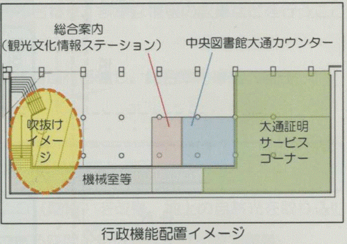ステーション、図書館の大通カウンターを一カ所に集約して、そこには地上の光が差し込む