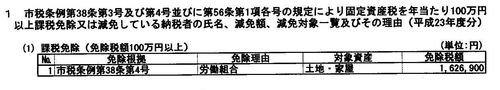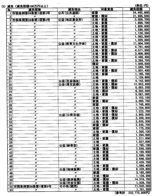 固定資産税を年あたり100万円以上課税免除、または減免している納税者