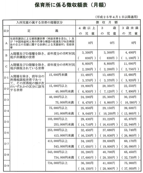 幼稚園の学費は各園の方針で自由に決めていますが、保育所は市役所が一律に決める