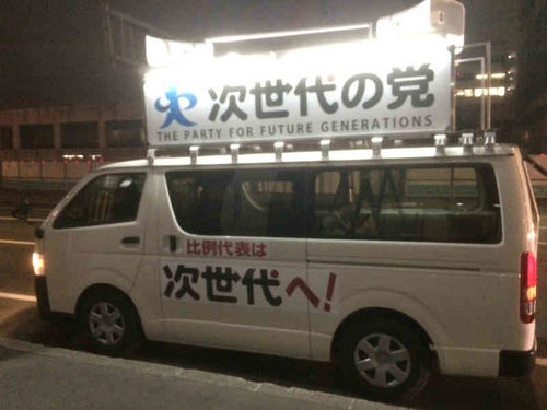 偶然、次世代の党の戦車(選挙カー)が走っているのを見つけました。