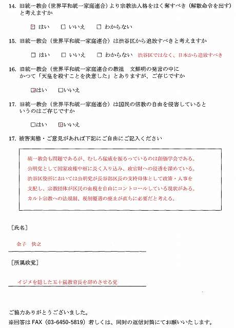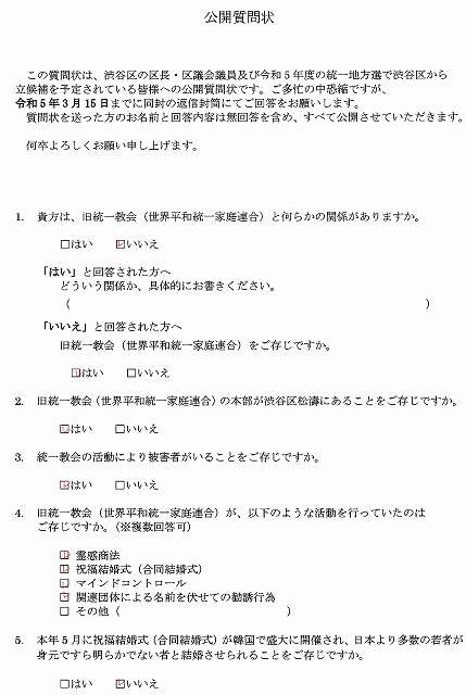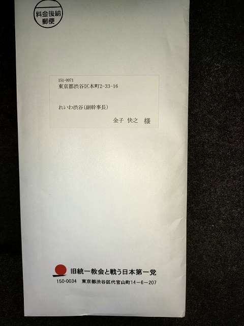 「旧統一教会と戦う日本第一党」から公開質問状が届きました。