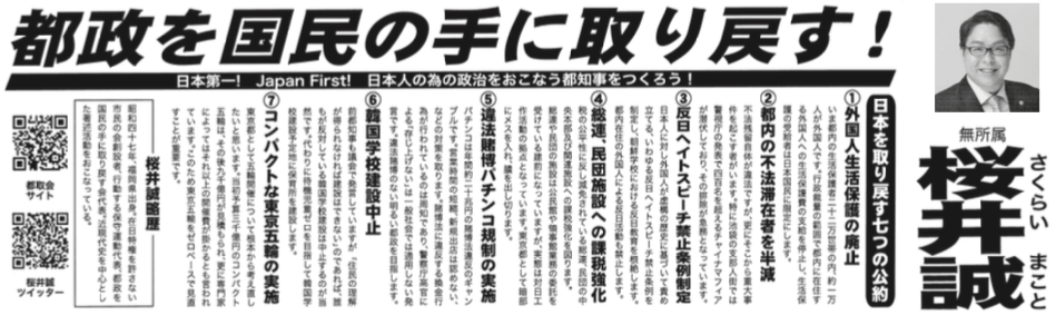パチンコ規制や外国人生活保護の廃止など、掲げた7つの政策には私も賛成です。